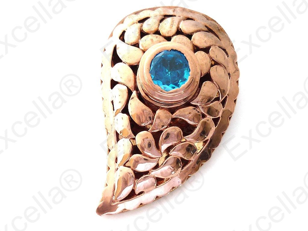 Handcrafted, paisley shaped 925 gold pendant in romantic brown finish with a surrounding border, fitted with an exquisite sparkling blue stone. Exclusive design reminiscent of lace work which allows a view of subjacent pendant base. A unique design which is bound to be a talking point. Length 4.1 cm, width 2.5 cm