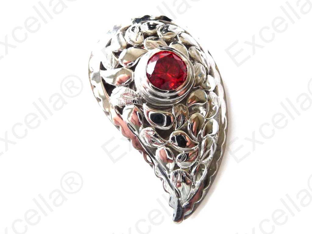 Handcrafted, paisley shaped 925 silver pendant, lavishly embossed and framed by a surrounding border, fitted with an exquisite sparkling red stone. Exclusive design reminiscent of lace work which allows a view of subjacent pendant base. This item is the perfect focal point for your face.