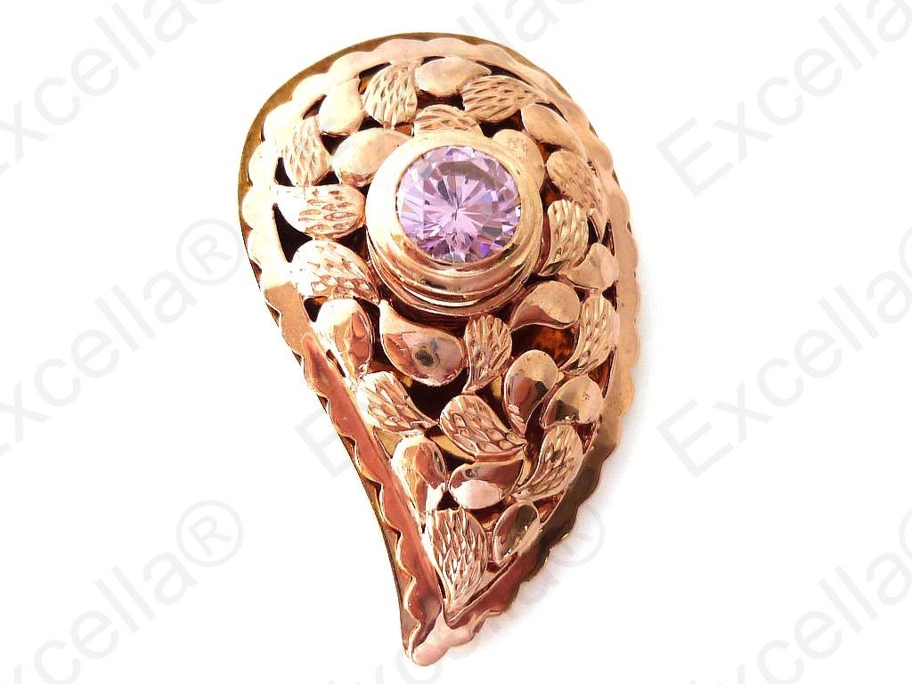 Precious paisley shaped, embossed pendant with surrounding border in 925 romantic brown plated in a golden hue and handcrafted and fitted with a brilliant pink stone. Spaces left between base and upper part allow for a delicate play of light and shade. It has been crafted with particular attention to the smallest details. Length 3.50 cm, width: 2.30 cm