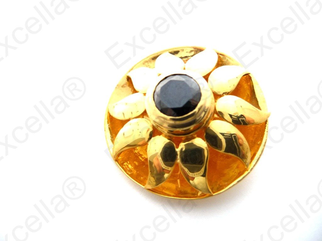 Handcrafted, sun shaped 925 silver pendant, fitted with an exclusive sparkling black stone and perfected with a warm golden finish. The cut outs allow the view onto the subjacent base plate of the pendant, catching the light with every move you make. A classic colour combination. Diameter: 3.0 cm