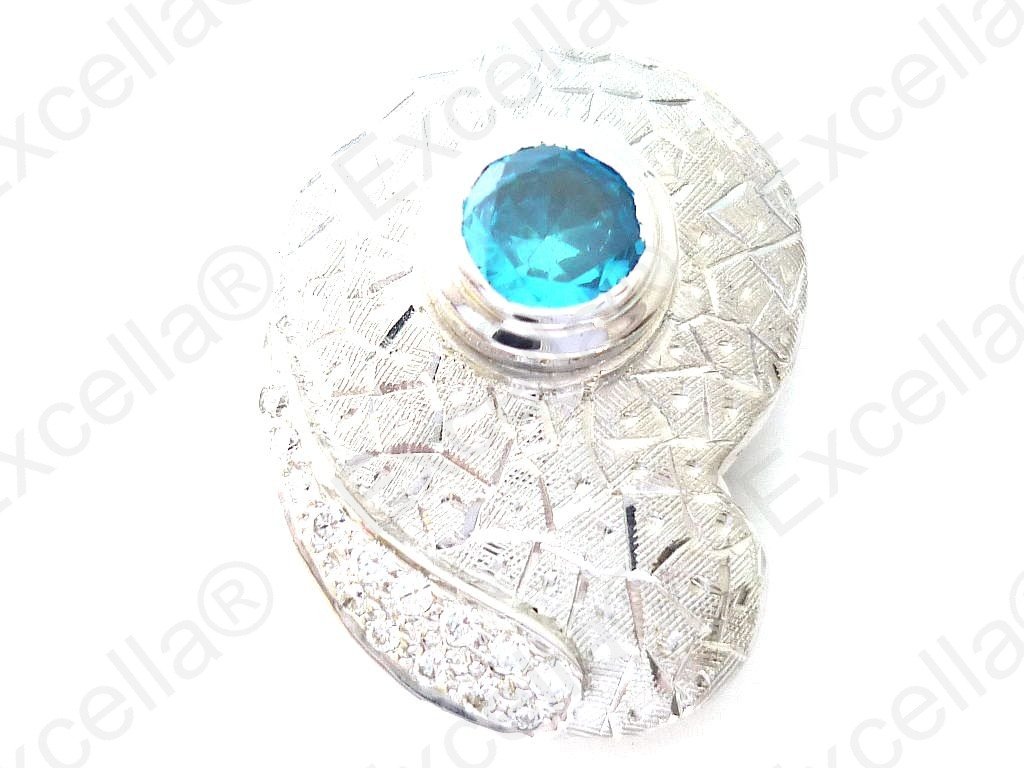 This is the beautiful, handcrafted pendant of 925 silver with an embossed criss-cross finish, fitted with a brilliant blue stone and enhanced with a curve of sparkling stones. Its appearance can be changed completely by exchanging the stone with another one from our range. A true eye catcher due to its unique design. Measurements: 3.4 x 2.5 cm