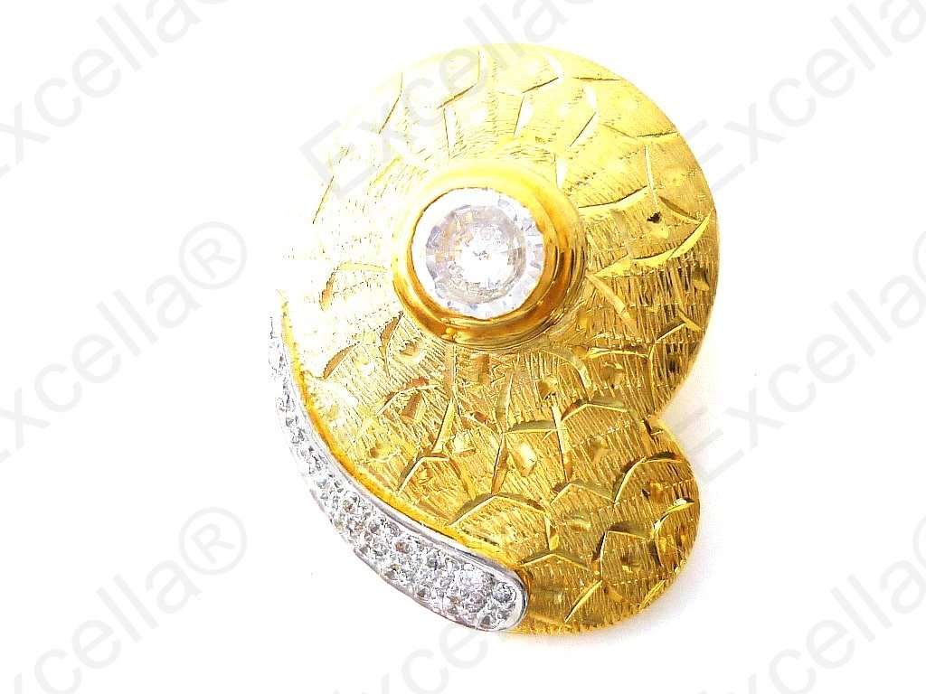 This is the beautiful, handcrafted pendant of 925 bright gold with an embossed criss-cross finish, fitted with a brilliant white stone and enhanced with a curve of sparkling stones. Its appearance can be changed completely by exchanging the stone with another one from our range. A true eye catcher due to its unique design. Measurements: 3.4 x 2.5 cm