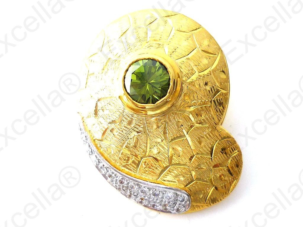 This is the beautiful, handcrafted pendant of 925 bright gold with an embossed criss-cross finish, fitted with a brilliant green stone and enhanced with a curve of sparkling stones. Its appearance can be changed completely by exchanging the stone with another one from our range. A true eye catcher due to its unique design. Measurements: 3.4 x 2.5 cm