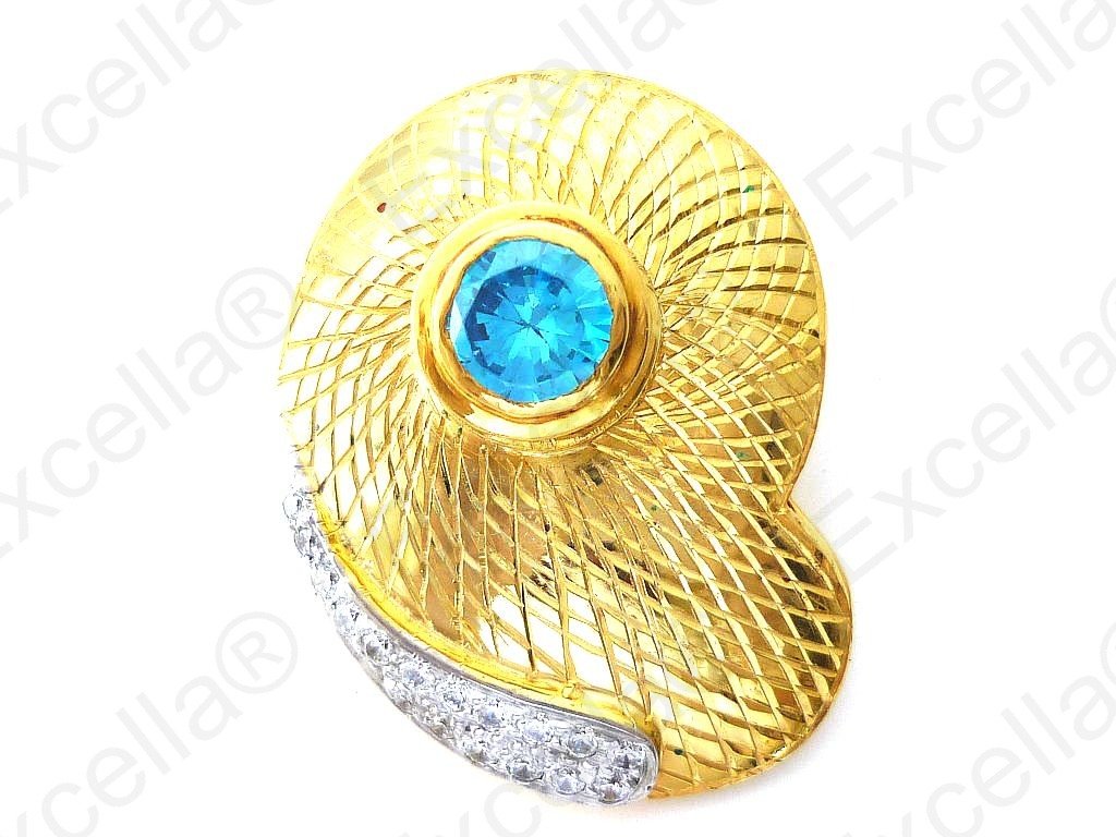 This is the beautiful, handcrafted pendant of 925 silver with an embossed warm golden finish, fitted with a brilliant blue stone and enhanced with a curve of sparkling stones. Its appearance can be changed completely by exchanging the stone with another one from our range. Reflects each and every ray of light surrounding you. Measurements: 3.4 x 2.5 cm