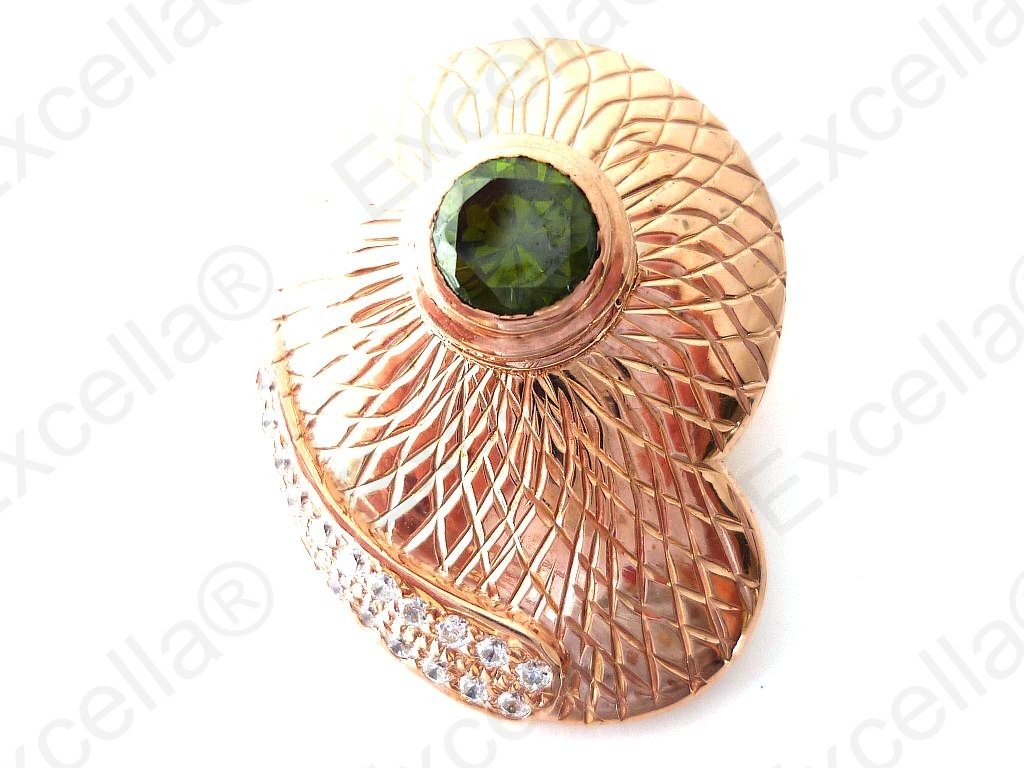 This is the beautiful, handcrafted pendant of 925 romantic brown with an embossed warm golden finish, fitted with a brilliant green stone and enhanced with a curve of sparkling stones. Its appearance can be changed completely by exchanging the stone with another one from our range. Reflects each and every ray of light surrounding you. Measurements: 3.4 x 2.5 cm
