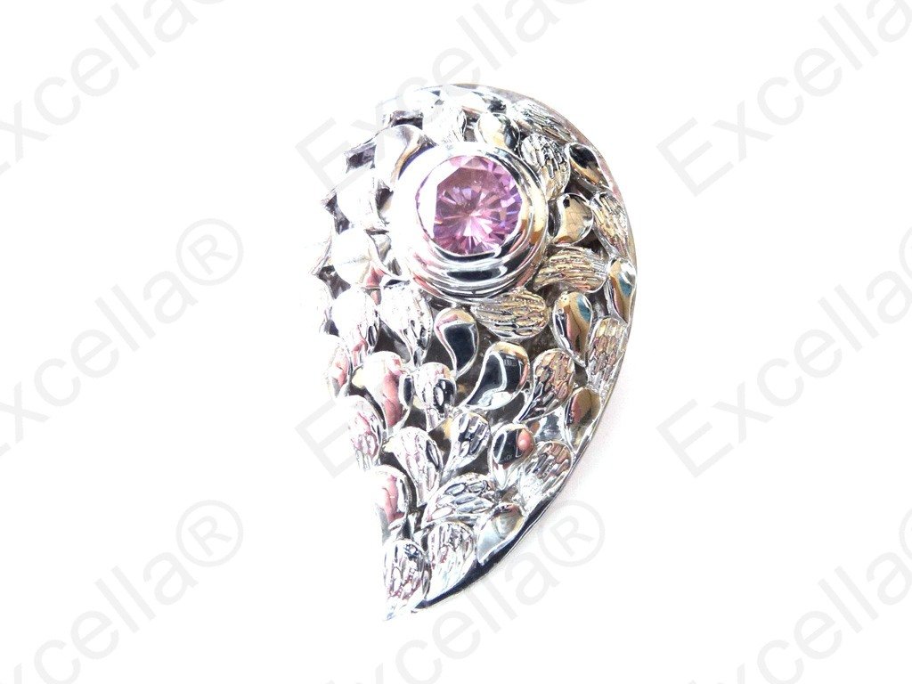 Elegant paisley shaped ring in 925 silver with an exquisite embossing, handcrafted and fitted with a brilliant pink stone. An intricate leafy design. Spaces left between base and upper part allow for a delicate play of light and shade. Length 3.60 cm, width 2.30 cm