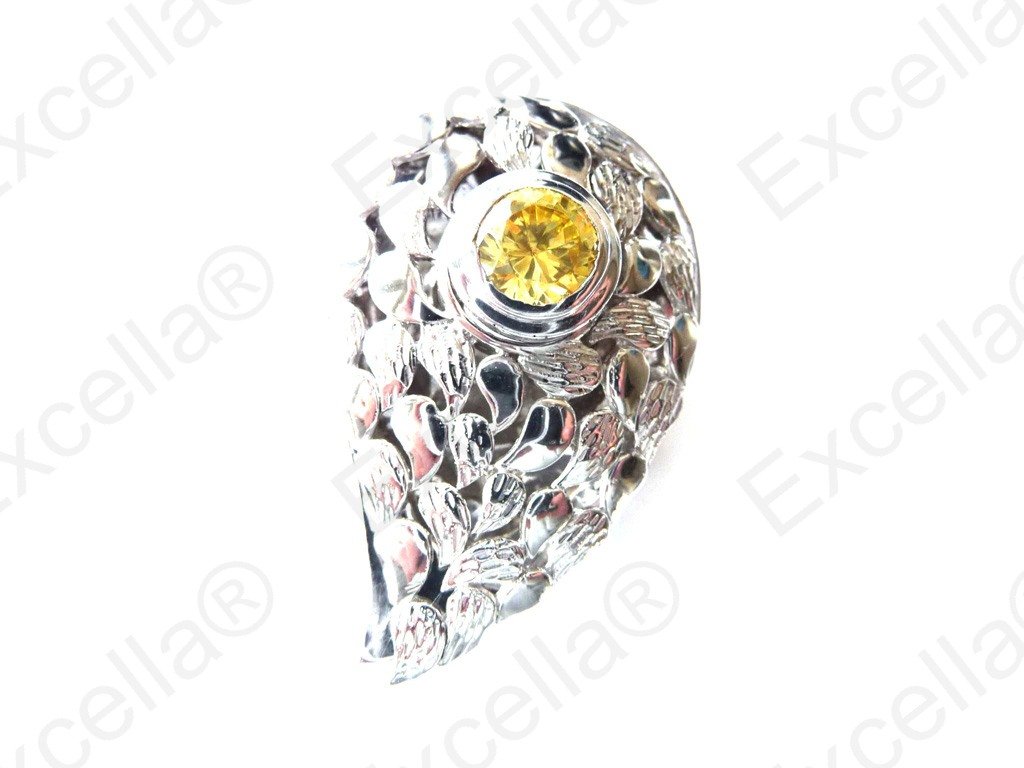 Elegant paisley shaped ring in 925 silver with an exquisite embossing, handcrafted and fitted with a brilliant yellow stone. An intricate leafy design. Spaces left between base and upper part allow for a delicate play of light and shade. Length 3.60 cm, width 2.30 cm