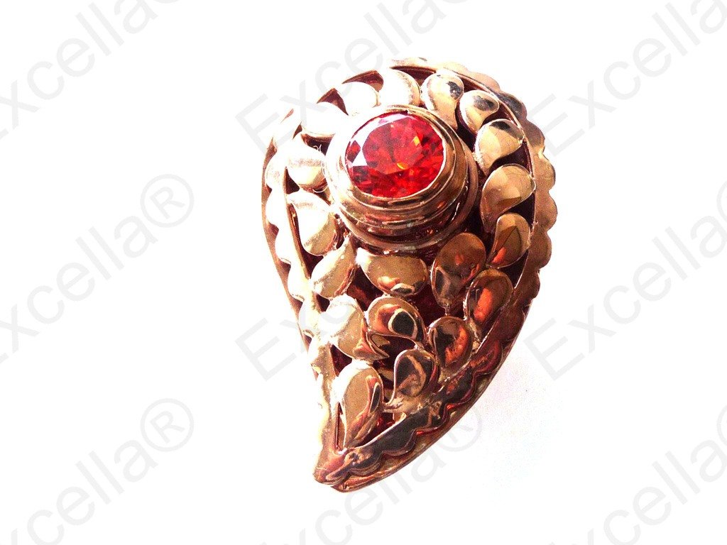 Precious paisley shaped ring with surrounding border in 925 silver, plated in a golden hue and handcrafted and fitted with a brilliant red stone. Spaces left between base and upper part allow for a delicate play of light and shade. It has been crafted with particular attention to the smallest details. Length 3.50 cm, width: 2.30 cm