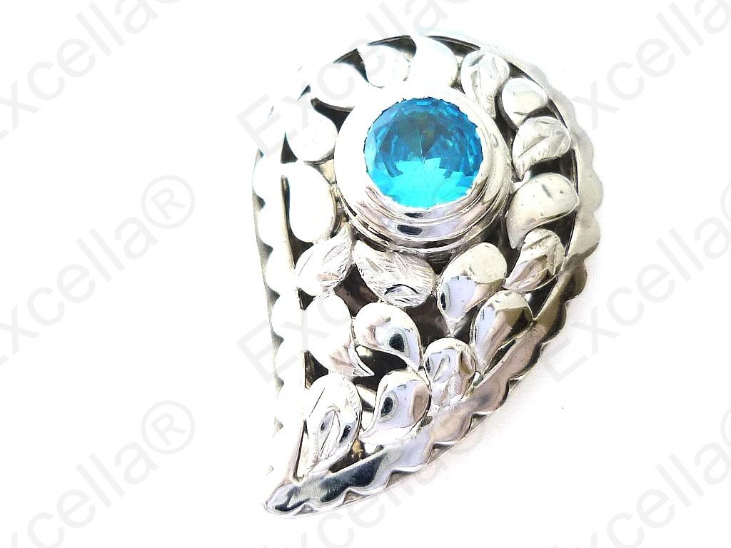 Precious paisley shaped ring with surrounding border in 925 embossed silver, handcrafted and fitted with a brilliant blue stone. Spaces left between base and upper part allow for a delicate play of light and shade. Length 3.50 cm, width: 2.30 cm