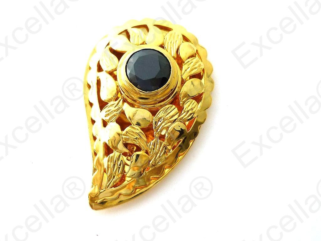 Precious paisley shaped, embossed ring with surrounding border in 925 silver, plated in a golden hue and handcrafted and fitted with a brilliant black stone. Spaces left between base and upper part allow for a delicate play of light and shade. It has been crafted with particular attention to the smallest details. Length 3.50 cm, width: 2.30 cm