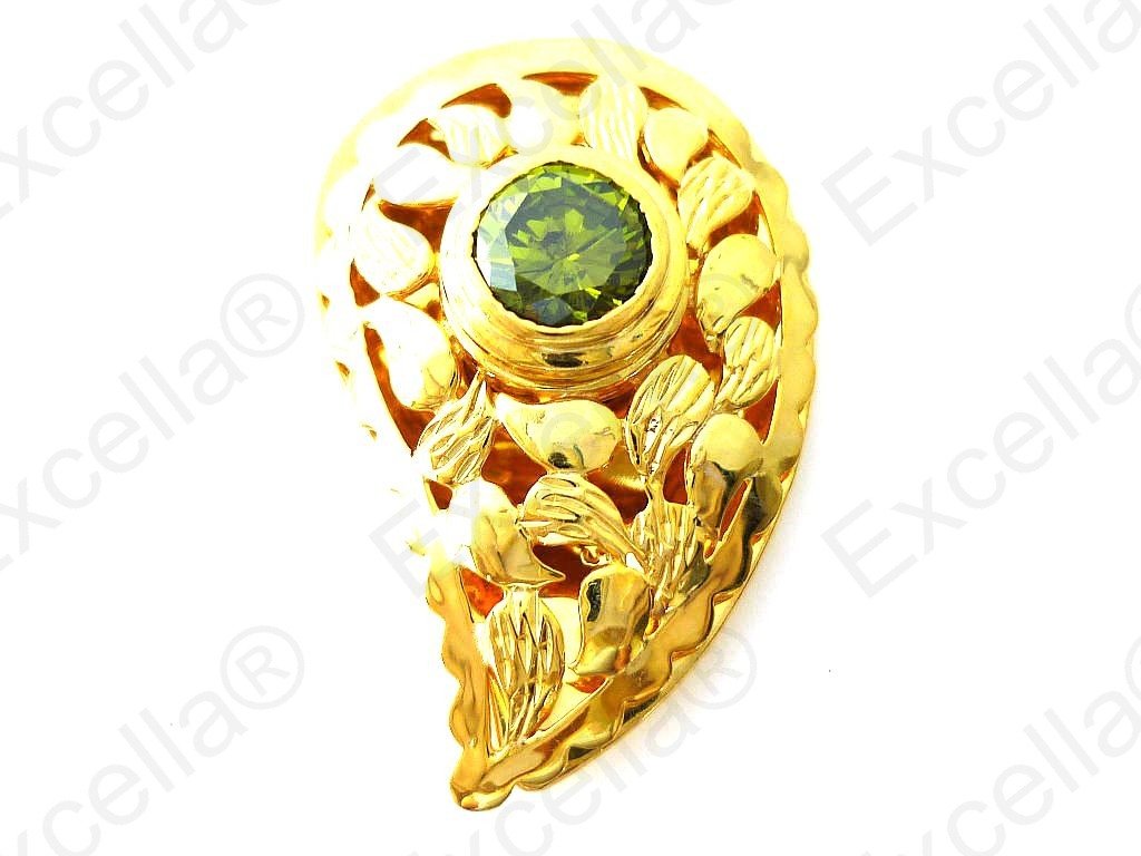 Precious paisley shaped, embossed ring with surrounding border in 925 silver, plated in a golden hue and handcrafted and fitted with a brilliant green stone. Spaces left between base and upper part allow for a delicate play of light and shade. It has been crafted with particular attention to the smallest details. Length 3.50 cm, width: 2.30 cm