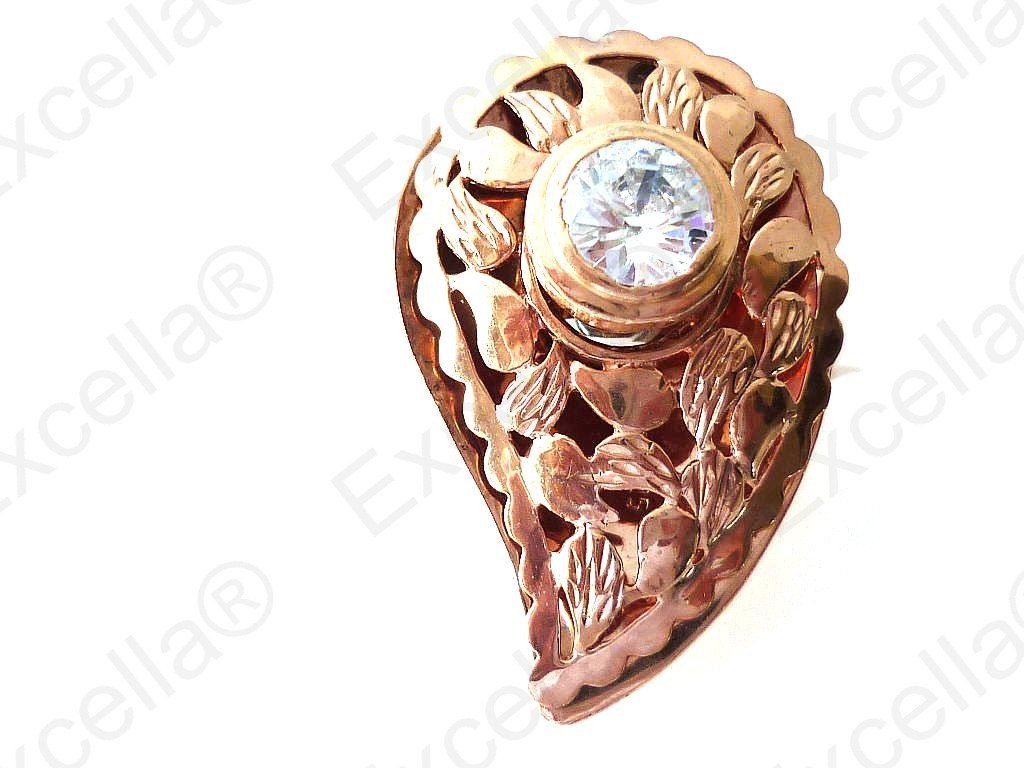 Precious paisley shaped, embossed ring with surrounding border in 925 romantic brown plated in a golden hue and handcrafted and fitted with a brilliant white stone. Spaces left between base and upper part allow for a delicate play of light and shade. It has been crafted with particular attention to the smallest details. Length 3.50 cm, width: 2.30 cm