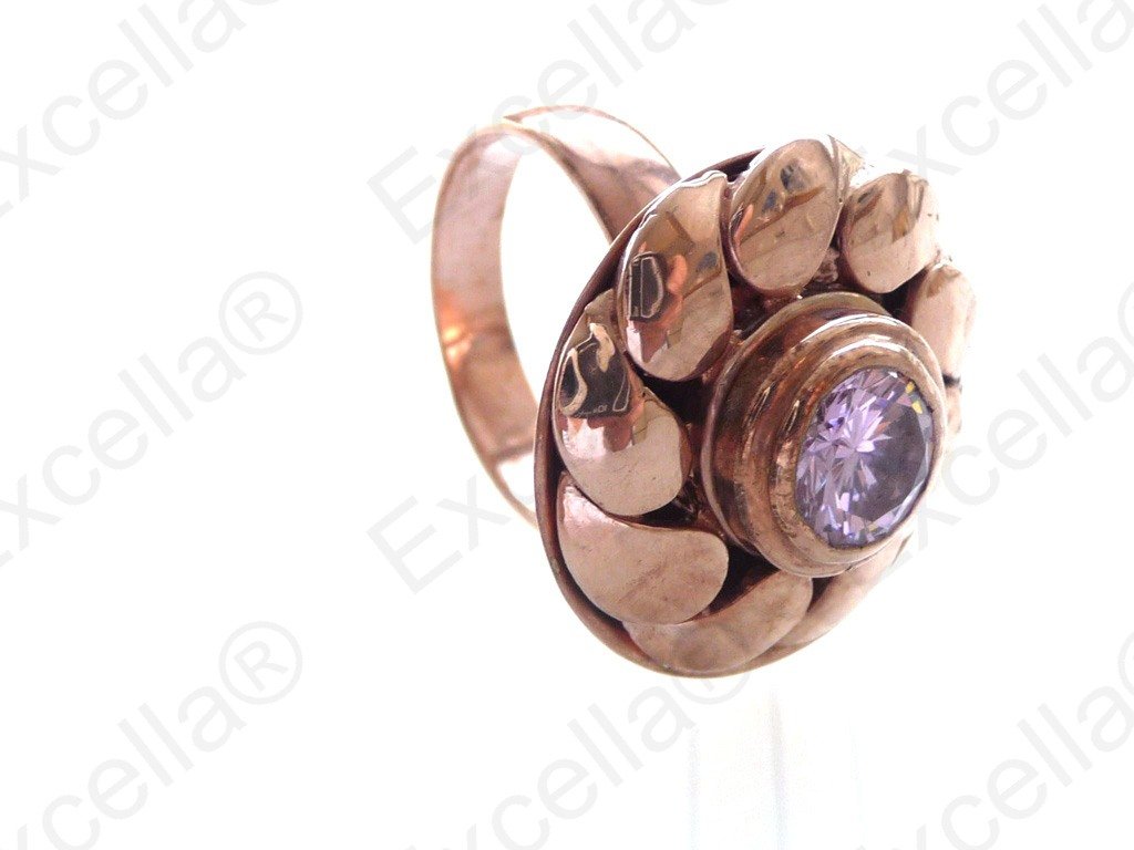 This smooth flower shaped ring has been handcrafted in 925 silver, finished with a romantic brown hue and fitted with a brilliant pink stone.