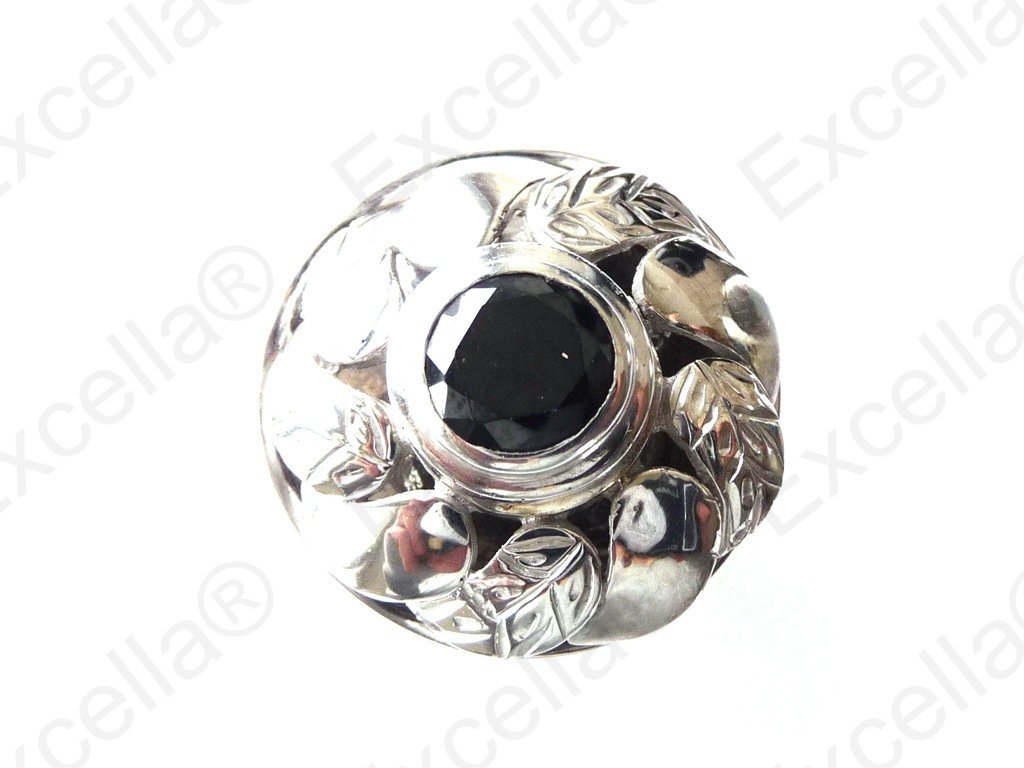 Harmonious flower shaped, embossed ring in 925 silver, handcrafted and fitted with a brilliant black stone.