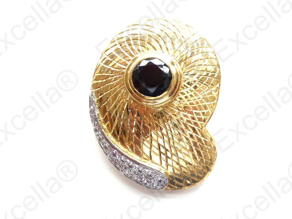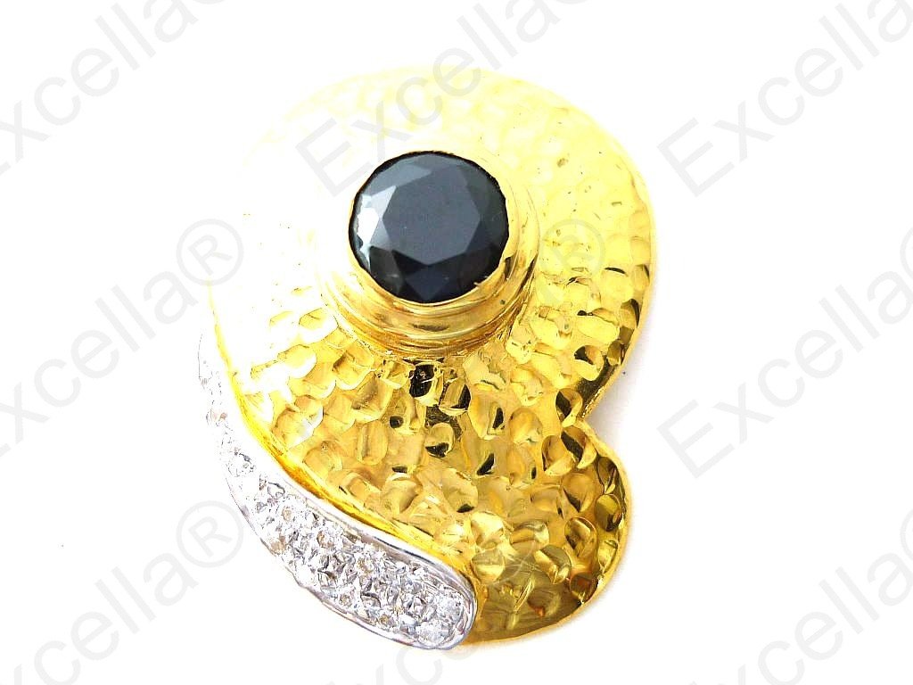 This is the ring from our beautiful, handcrafted collection made of 925 embossed bright gold in a criss-cross pattern, enhanced by its golden hue and the sparkling curve. It has been fitted with a radiant black stone. A true eye catcher due to its unique design and a perfect match for your hand. Measurements: 3 x 2.3 cm