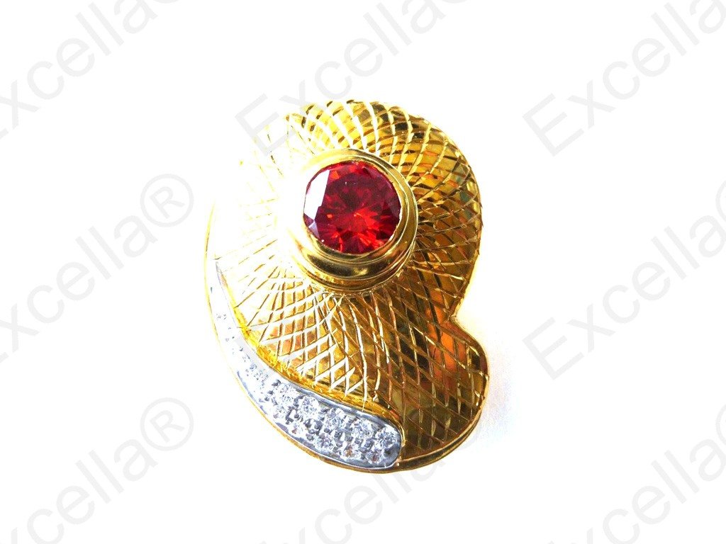 This is the ring from our beautiful, handcrafted collection made of 925 embossed silver in a criss-cross pattern, enhanced by its golden hue and the sparkling curve. It has been fitted with a radiant red stone. A true eye catcher due to its unique design and a perfect match for your hand. Measurements: 3 x 2.3 cm