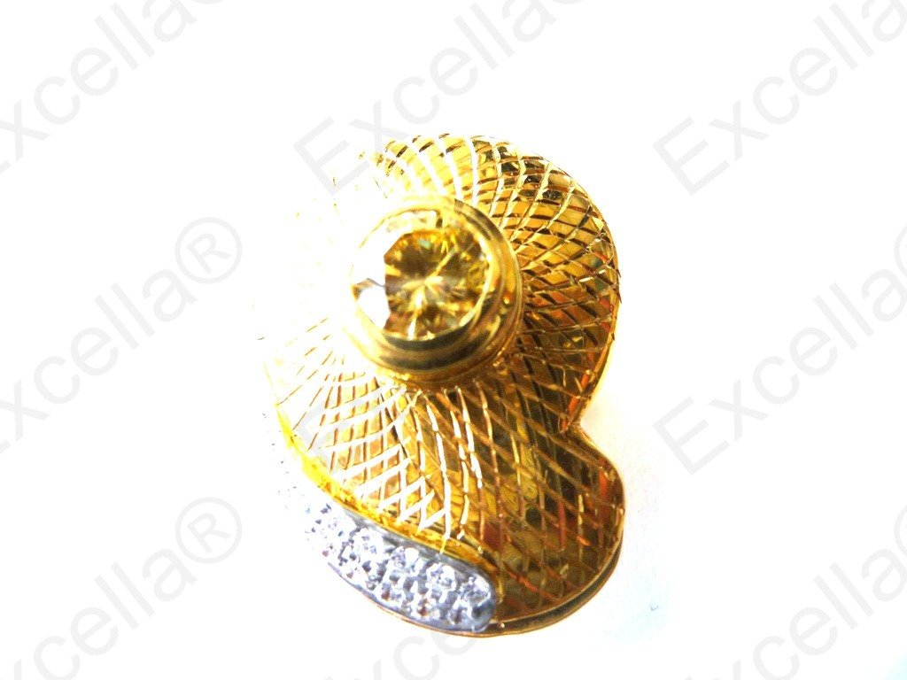 This is the ring from our beautiful, handcrafted collection made of 925 embossed bright gold in a criss-cross pattern, enhanced by its golden hue and the sparkling curve. It has been fitted with a radiant white stone. A true eye catcher due to its unique design and a perfect match for your hand. Measurements: 3 x 2.3 cm