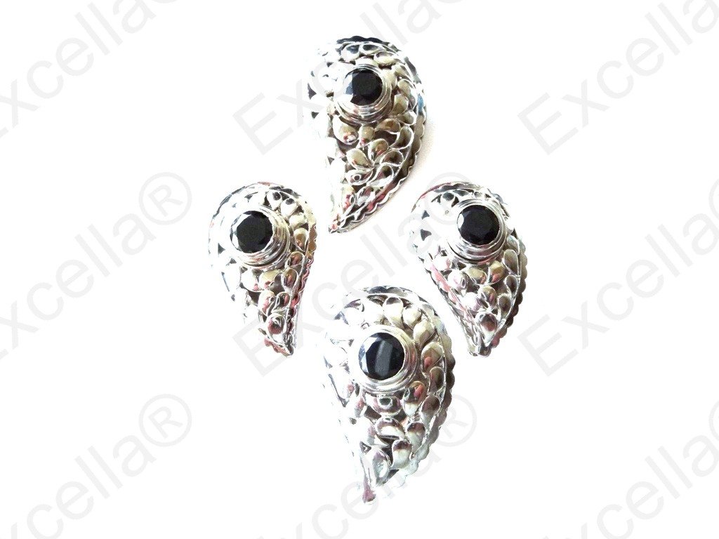 Our paisley shaped, bordered handcrafted set of 925 silver combined with a jet black stone. Perfect in combination but also great when just it's single pieces are worn. 2 earrings of 3 cm length and 1.9 cm width, 1 pendant of 4 cm length and 2.5 cm width, 1 ring of 3.6 cm length and 2.3 cm width