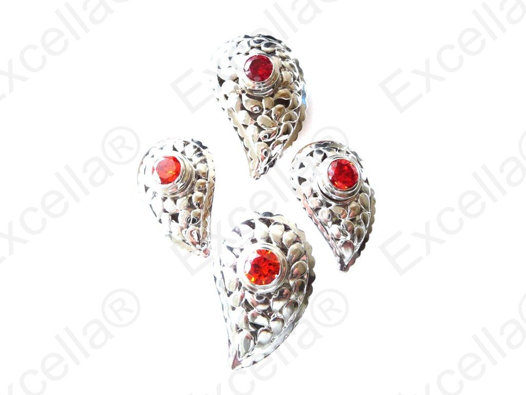 Our paisley shaped, bordered handcrafted set of 925 silver combined with a red stone. Perfect in combination but also great when just it's single pieces are worn. 2 earrings of 3 cm length and 1.9 cm width, 1 pendant of 4 cm length and 2.5 cm width, 1 ring of 3.6 cm length and 2.3 cm width