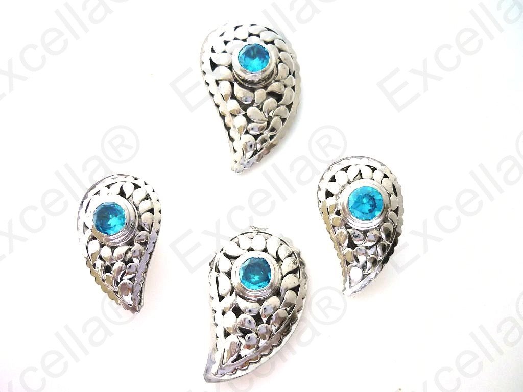 Our paisley shaped, bordered handcrafted set of 925 silver combined with a blue stone. Perfect in combination but also great when just it's single pieces are worn. 2 earrings of 3 cm length and 1.9 cm width, 1 pendant of 4 cm length and 2.5 cm width, 1 ring of 3.6 cm length and 2.3 cm width