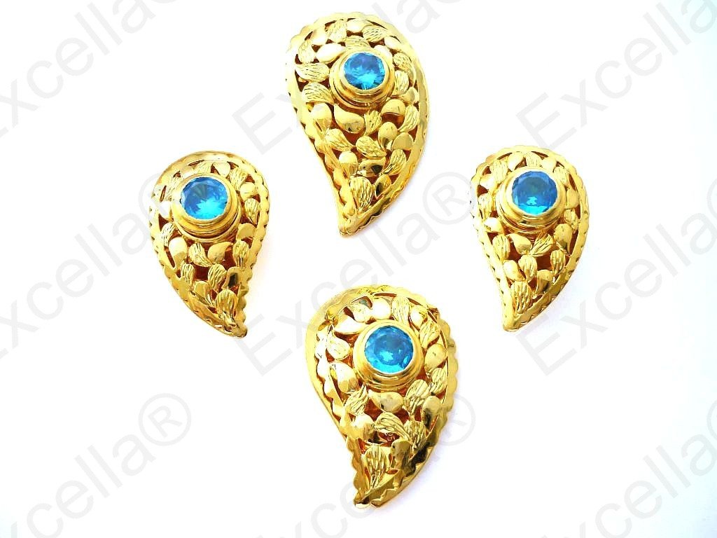 Our paisley shaped, bordered handcrafted set of 925 silver with an embossed rich gold finish, combined with a blue stone. Perfect in combination but also great when just it's single pieces are worn. 2 earrings of 3 cm length and 1.9 cm width, 1 pendant of 4 cm length and 2.5 cm width, 1 ring of 3.6 cm length and 2.3 cm width