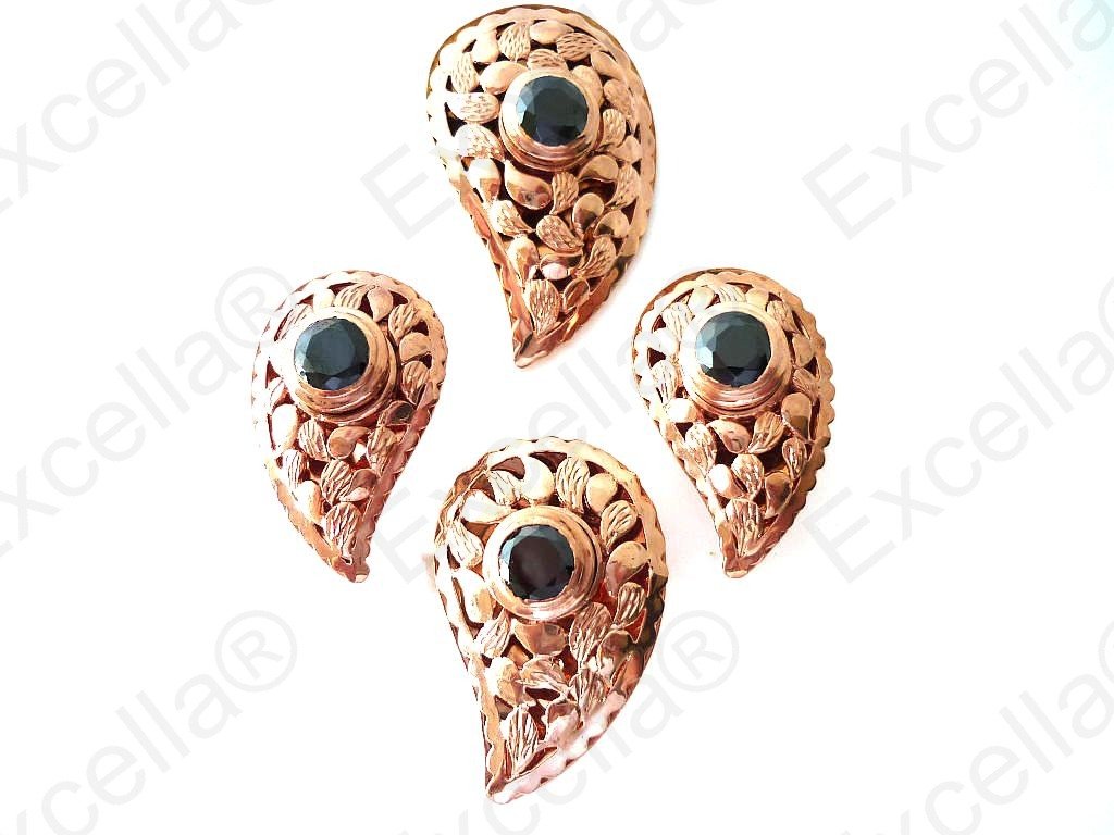 Our paisley shaped, bordered handcrafted set of 925 romantic brown with an embossed rich gold finish, combined with a black stone. Perfect in combination but also great when just it's single pieces are worn. 2 earrings of 3 cm length and 1.9 cm width, 1 pendant of 4 cm length and 2.5 cm width, 1 ring of 3.6 cm length and 2.3 cm width