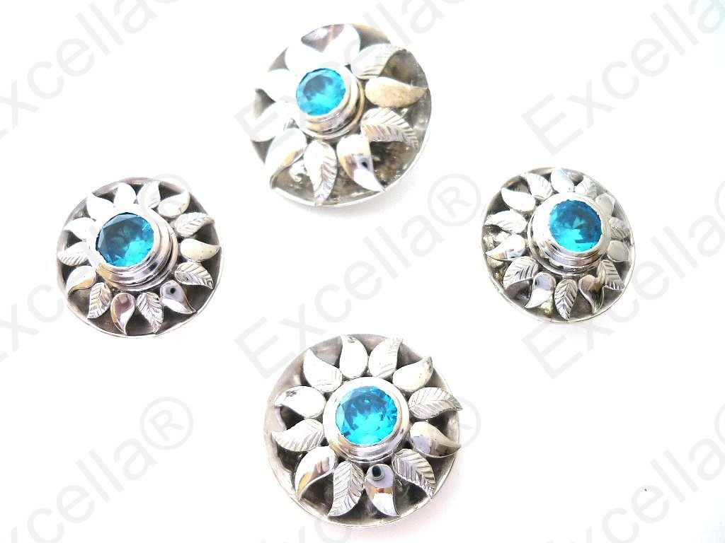 This beautiful and intrinsically handcrafted set with a 925 embossed silver sun shaped casing with a blue stone set in the centre makes for a perfect combination. 2 earrings of 2.1 cm diameter each, 1 pendant of 3 cm diameter, 1 ring of 2.5 cm diameter