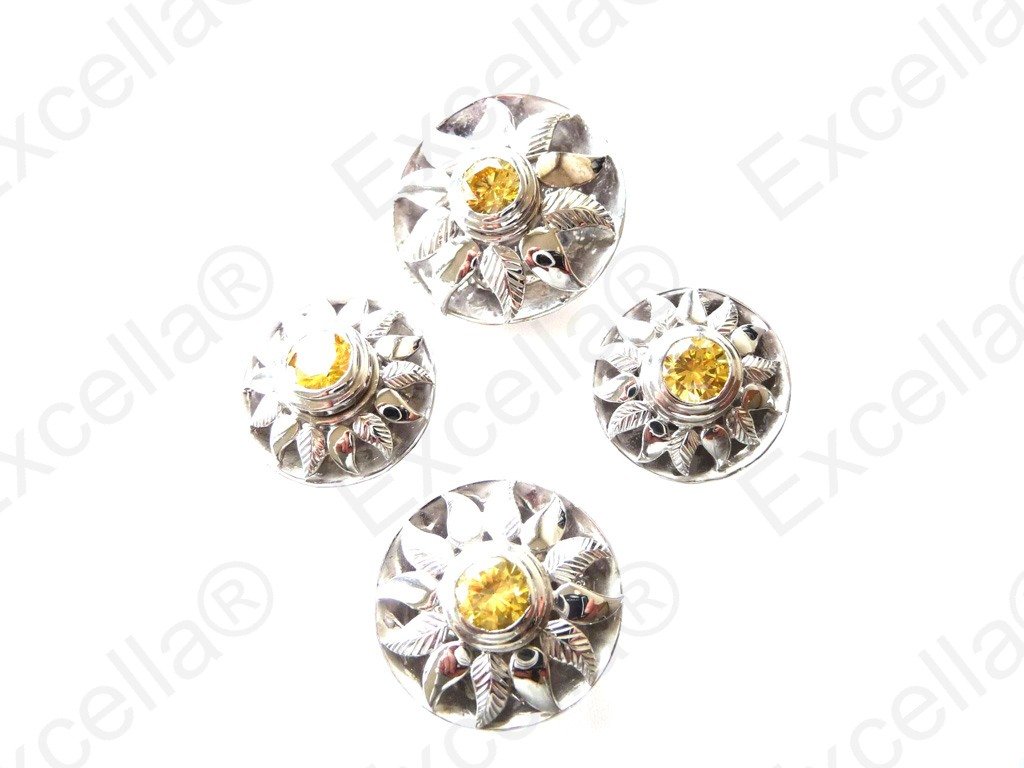 This beautiful and intrinsically handcrafted set with a 925 embossed silver sun shaped casing with a yellow stone set in the centre makes for a perfect combination. 2 earrings of 2.1 cm diameter each, 1 pendant of 3 cm diameter, 1 ring of 2.5 cm diameter