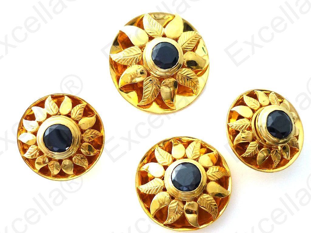 This beautiful and intrinsically handcrafted, embossed set with a 925 silver sun shaped casing with a warm gold finish and a black stone set in the centre makes for a perfect combination. 2 earrings of 2.1 cm diameter each, 1 pendant of 3 cm diameter, 1 ring of 2.5 cm diameter