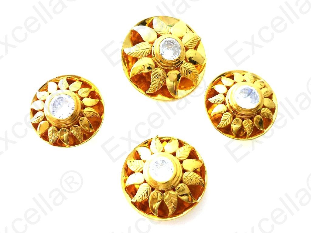 This beautiful and intrinsically handcrafted, embossed set with a 925 silver sun shaped casing with a warm gold finish and a white stone set in the centre makes for a perfect combination. 2 earrings of 2.1 cm diameter each, 1 pendant of 3 cm diameter, 1 ring of 2.5 cm diameter
