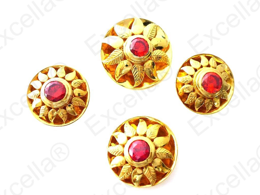 This beautiful and intrinsically handcrafted, embossed set with a 925 silver sun shaped casing with a warm gold finish and a red stone set in the centre makes for a perfect combination. 2 earrings of 2.1 cm diameter each, 1 pendant of 3 cm diameter, 1 ring of 2.5 cm diameter