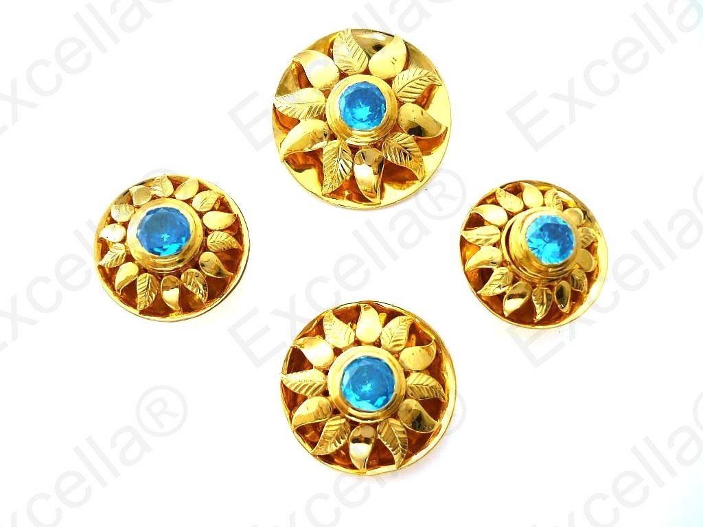 This beautiful and intrinsically handcrafted, embossed set with a 925 silver sun shaped casing with a warm gold finish and a blue stone set in the centre makes for a perfect combination. 2 earrings of 2.1 cm diameter each, 1 pendant of 3 cm diameter, 1 ring of 2.5 cm diameter