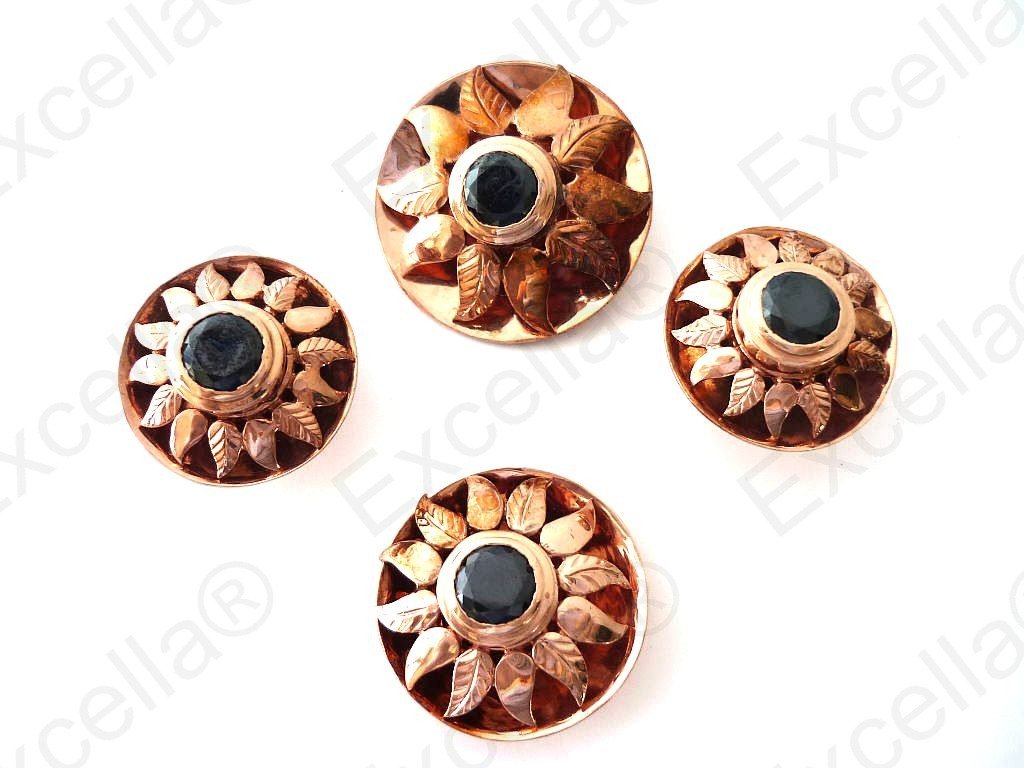 This beautiful and intrinsically handcrafted, embossed set with a 925 romantic brown sun shaped casing with a warm gold finish and a black stone set in the centre makes for a perfect combination. 2 earrings of 2.1 cm diameter each, 1 pendant of 3 cm diameter, 1 ring of 2.5 cm diameter