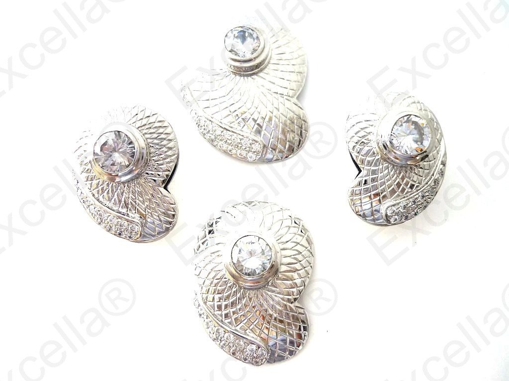 This is the complete set of a beautiful, handcrafted collection made of 925 silver with an embossed chequered finish. Each of these items is fitted with a brilliant white stone. The various pieces of this set can be interchanged in such a manner that you create your very own masterpiece. A true eye catcher due to its unique design. Pendant: 3.4 x 2.5 cm, Ring: 3 x 2.3 cm, Earrings: 2.5 x 1.8 cm