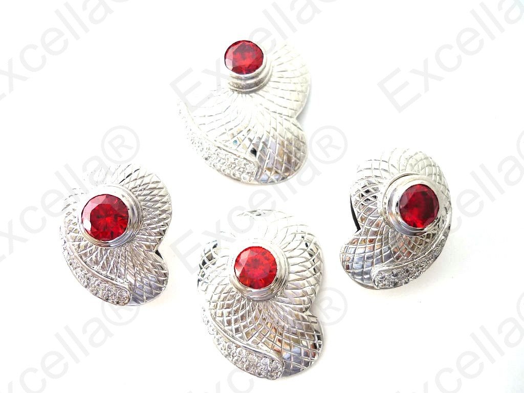 This is the complete set of a beautiful, handcrafted collection made of 925 silver with an embossed chequered finish. Each of these items is fitted with a brilliant red stone. The various pieces of this set can be interchanged in such a manner that you create your very own masterpiece. A true eye catcher due to its unique design. Pendant: 3.4 x 2.5 cm, Ring: 3 x 2.3 cm, Earrings: 2.5 x 1.8 cm