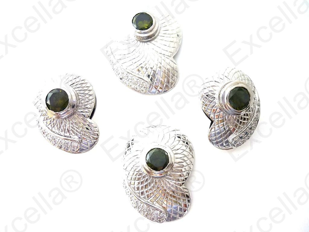 This is the complete set of a beautiful, handcrafted collection made of 925 silver with an embossed chequered finish. Each of these items is fitted with a brilliant green stone. The various pieces of this set can be interchanged in such a manner that you create your very own masterpiece. A true eye catcher due to its unique design. Pendant: 3.4 x 2.5 cm, Ring: 3 x 2.3 cm, Earrings: 2.5 x 1.8 cm