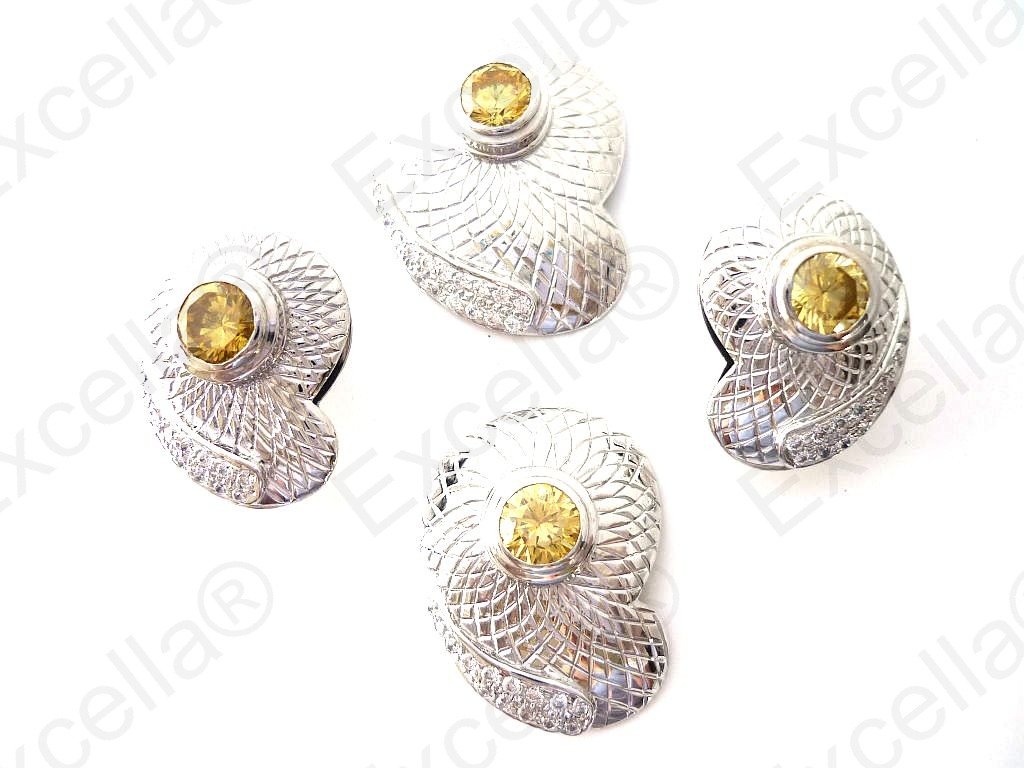 This is the complete set of a beautiful, handcrafted collection made of 925 silver with an embossed chequered finish. Each of these items is fitted with a brilliant yellow stone. The various pieces of this set can be interchanged in such a manner that you create your very own masterpiece. A true eye catcher due to its unique design. Pendant: 3.4 x 2.5 cm, Ring: 3 x 2.3 cm, Earrings: 2.5 x 1.8 cm