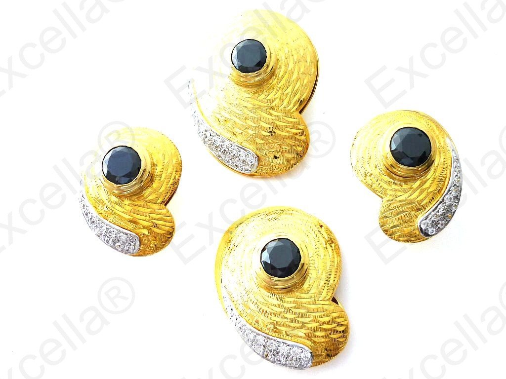 This is the complete set of a beautiful, handcrafted collection made of 925 embossed gold. Each of these items is fitted with a radiant black stone. The various pieces of this set can be interchanged in such a manner that you create your very own masterpiece. A true eye catcher due to its unique design. Pendant: 3.4 x 2.5 cm, ring: 3 x 2.3 cm, Earrings: 2.5 x 1.8 cm