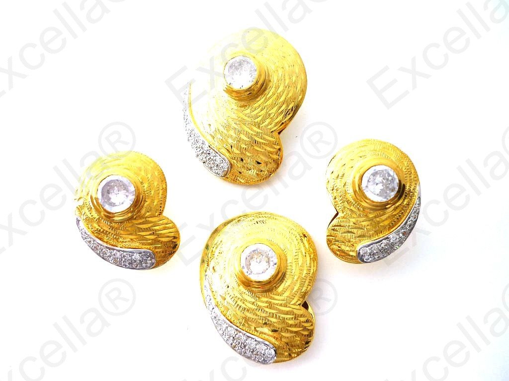 This is the complete set of a beautiful, handcrafted collection made of 925 embossed gold. Each of these items is fitted with a radiant white stone. The various pieces of this set can be interchanged in such a manner that you create your very own masterpiece. A true eye catcher due to its unique design. Pendant: 3.4 x 2.5 cm, ring: 3 x 2.3 cm, Earrings: 2.5 x 1.8 cm