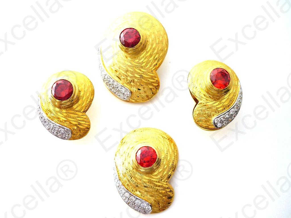 This is the complete set of a beautiful, handcrafted collection made of 925 embossed gold. Each of these items is fitted with a radiant red stone. The various pieces of this set can be interchanged in such a manner that you create your very own masterpiece. A true eye catcher due to its unique design. Pendant: 3.4 x 2.5 cm, ring: 3 x 2.3 cm, Earrings: 2.5 x 1.8 cm