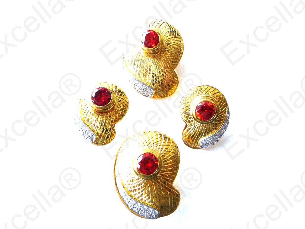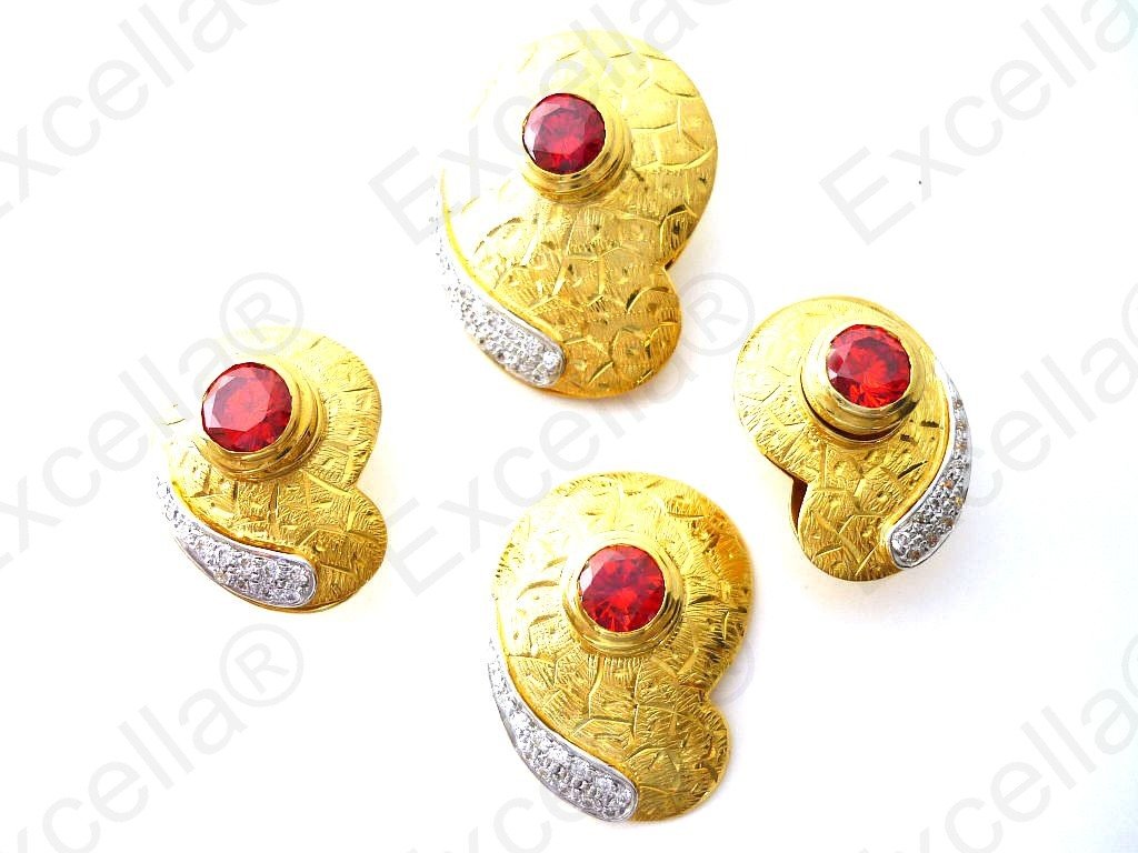 This is the complete set of a beautiful, handcrafted collection made of 925 embossed silver with a warm golden finish. Each of these items is fitted with a brilliant red stone. The various pieces of this set can be interchanged in such a manner that you can create your very own masterpiece. A focal point whether worn as set or as single piece. Pendant: 3.4 x 2.5 cm, Ring: 3 x 2.3 cm, ear-rings: 2.5 x 1.8 cm