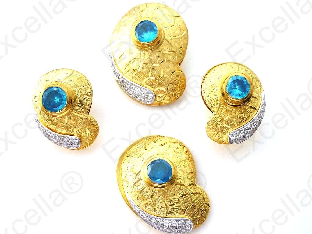 This is the complete set of a beautiful, handcrafted collection made of 925 gold with an embossed criss-cross finish. Each of these items is fitted with a brilliant yellow stone. The various pieces of this set can be interchanged in such a manner that you create your very own masterpiece. A true eye catcher due to its unique design. Pendant: 3.4 x 2.5 cm, Ring: 3 x 2.3 cm, Earrings: 2.5 x 1.8 cm