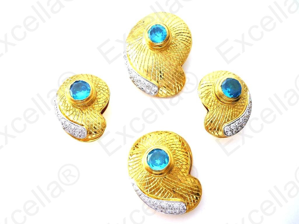 This is the complete set of a beautiful, handcrafted collection made of 925 embossed silver with a warm golden finish. Each of these items is fitted with a brilliant blue stone. The various pieces of this set can be interchanged in such a manner that you can create your very own masterpiece. A focal point whether worn as set or as single piece. Pendant: 3.4 x 2.5 cm, Ring: 3 x 2.3 cm, ear-rings: 2.5 x 1.8 cm