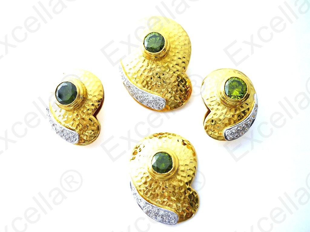 This is the complete set of a beautiful, handcrafted collection made of 925 embossed bright gold with a romantic brown finish. Each of these items is fitted with a green stone. The various pieces of this set can be interchanged in such a manner that you can create your very own masterpiece. A focal point whether worn as set or as single piece. Pendant: 3.4 x 2.5 cm, Ring: 3 x 2.3 cm, Earrings: 2.5 x 1.8 cm
