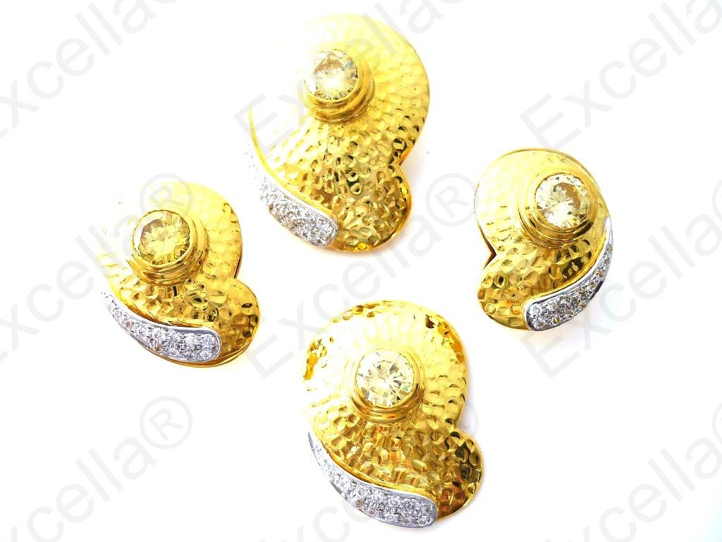 This is the complete set of a beautiful, handcrafted collection made of 925 embossed bright gold with a romantic brown finish. Each of these items is fitted with a yellow stone. The various pieces of this set can be interchanged in such a manner that you can create your very own masterpiece. A focal point whether worn as set or as single piece. Pendant: 3.4 x 2.5 cm, Ring: 3 x 2.3 cm, Earrings: 2.5 x 1.8 cm
