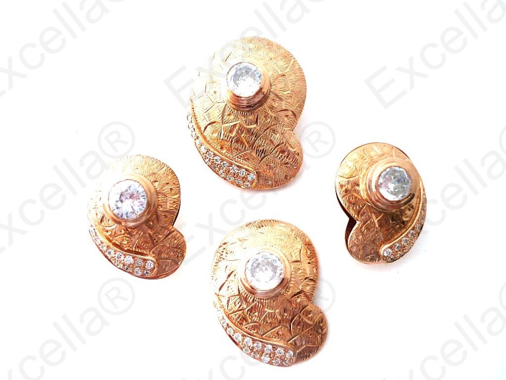 This is the complete set of a beautiful, handcrafted collection made of 925 romantic brown with an embossed criss-cross finish. Each of these items is fitted with a brilliant white stone. The various pieces of this set can be interchanged in such a manner that you create your very own masterpiece. A true eye catcher due to its unique design. Pendant: 3.4 x 2.5 cm, Ring: 3 x 2.3 cm, Earrings: 2.5 x 1.8 cm
