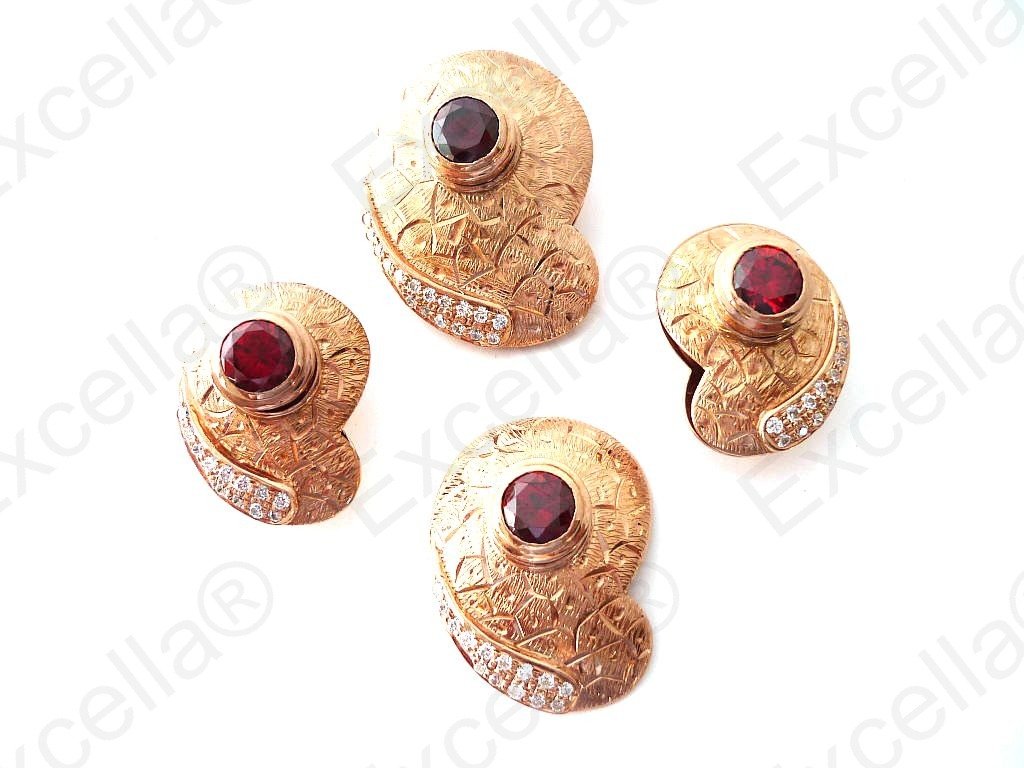 This is the complete set of a beautiful, handcrafted collection made of 925 romantic brown with an embossed criss-cross finish. Each of these items is fitted with a brilliant red stone. The various pieces of this set can be interchanged in such a manner that you create your very own masterpiece. A true eye catcher due to its unique design. Pendant: 3.4 x 2.5 cm, Ring: 3 x 2.3 cm, Earrings: 2.5 x 1.8 cm