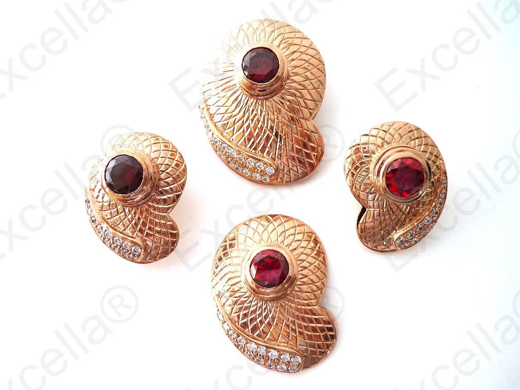 This is the complete set of a beautiful, handcrafted collection made of 925 embossed silver with a warm golden finish. Each of these items is fitted with a brilliant red stone. The various pieces of this set can be interchanged in such a manner that you can create your very own masterpiece. A focal point whether worn as set or as single piece. Pendant: 3.4 x 2.5 cm, Ring: 3 x 2.3 cm, ear-rings: 2.5 x 1.8 cm