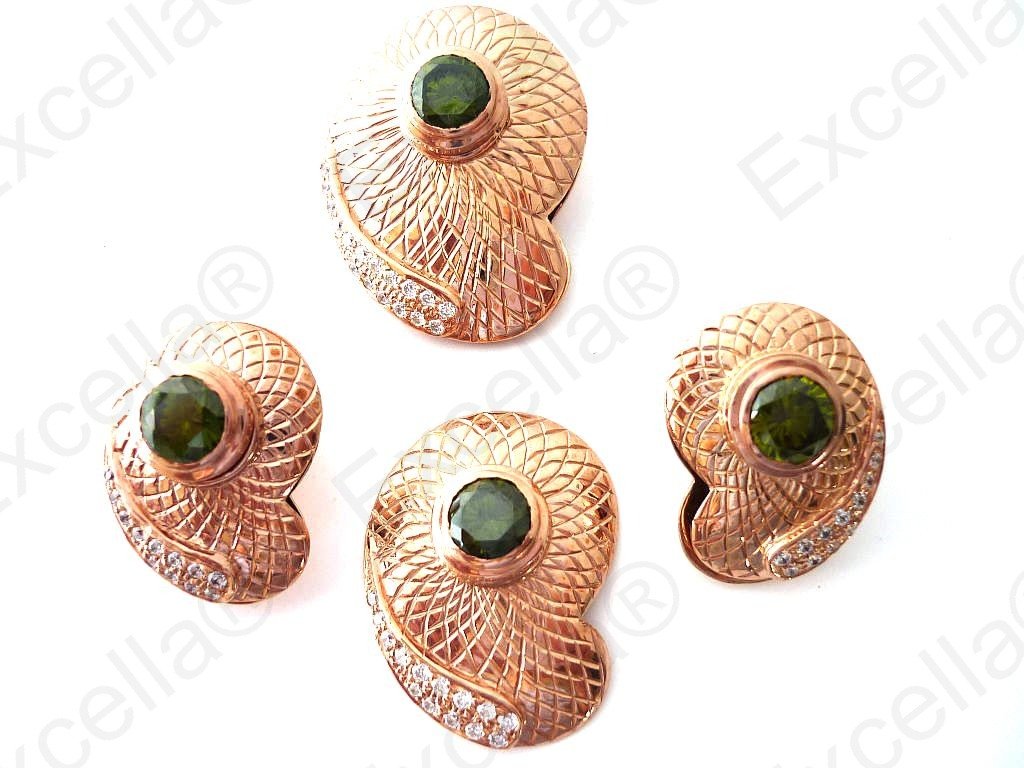 This is the complete set of a beautiful, handcrafted collection made of 925 embossed silver with a warm golden finish. Each of these items is fitted with a brilliant green stone. The various pieces of this set can be interchanged in such a manner that you can create your very own masterpiece. A focal point whether worn as set or as single piece. Pendant: 3.4 x 2.5 cm, Ring: 3 x 2.3 cm, ear-rings: 2.5 x 1.8 cm