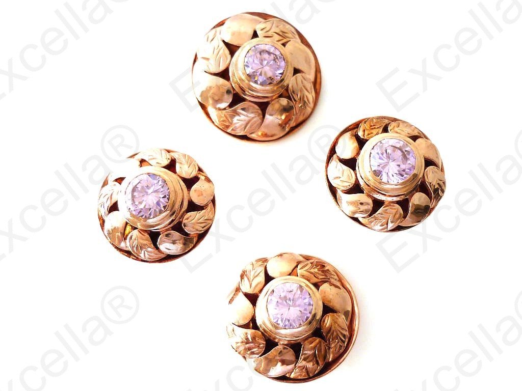 Our flower shaped, handcrafted set of gold plated 925 embossed gold with a pink translucent stone: 2 earrings of 1.9 cm diameter, 1 pendant of 2.5 cm diameter, 1 ring of 2.2 cm diameter